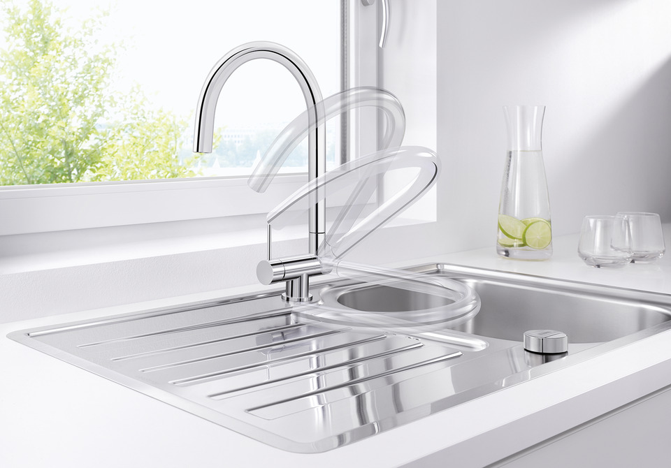 - De uitloop past in de spoelbak dankzij de afmetingen van de kraan